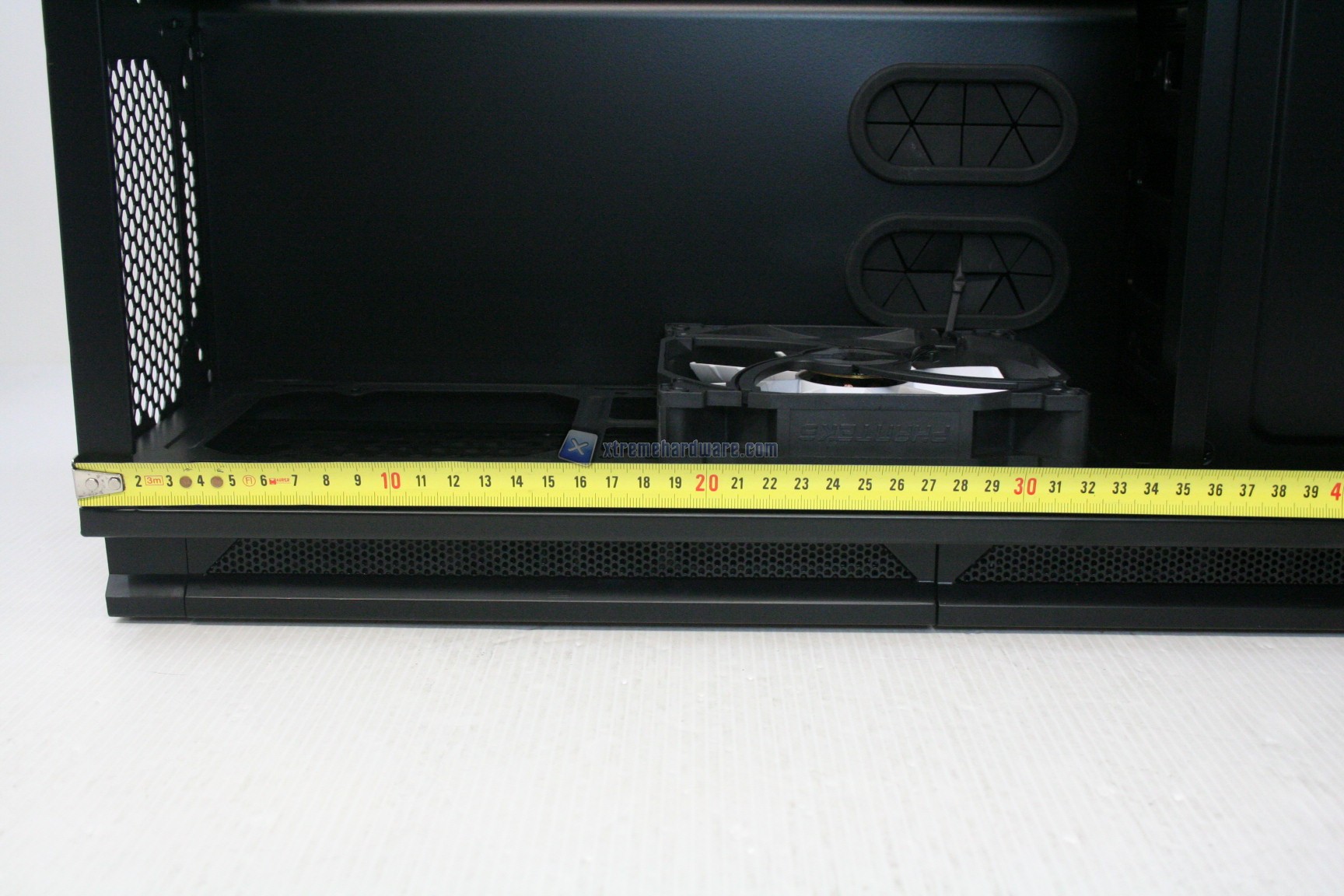 Il piatto della scheda madre è interamente in acciaio, e diversamente da alcuni modelli di cabinet top di gamma degli anni passati, non è removibile. Sono presenti sette grandi aperture dotate di gomma antitaglio, di ottima fattura e molto resistenti alla rimozione accidentale, più altre due in basso. Le tre laterali però sono coperte da una placca che serve per l’installazione di vaschette verticali, però può essere rimossa.